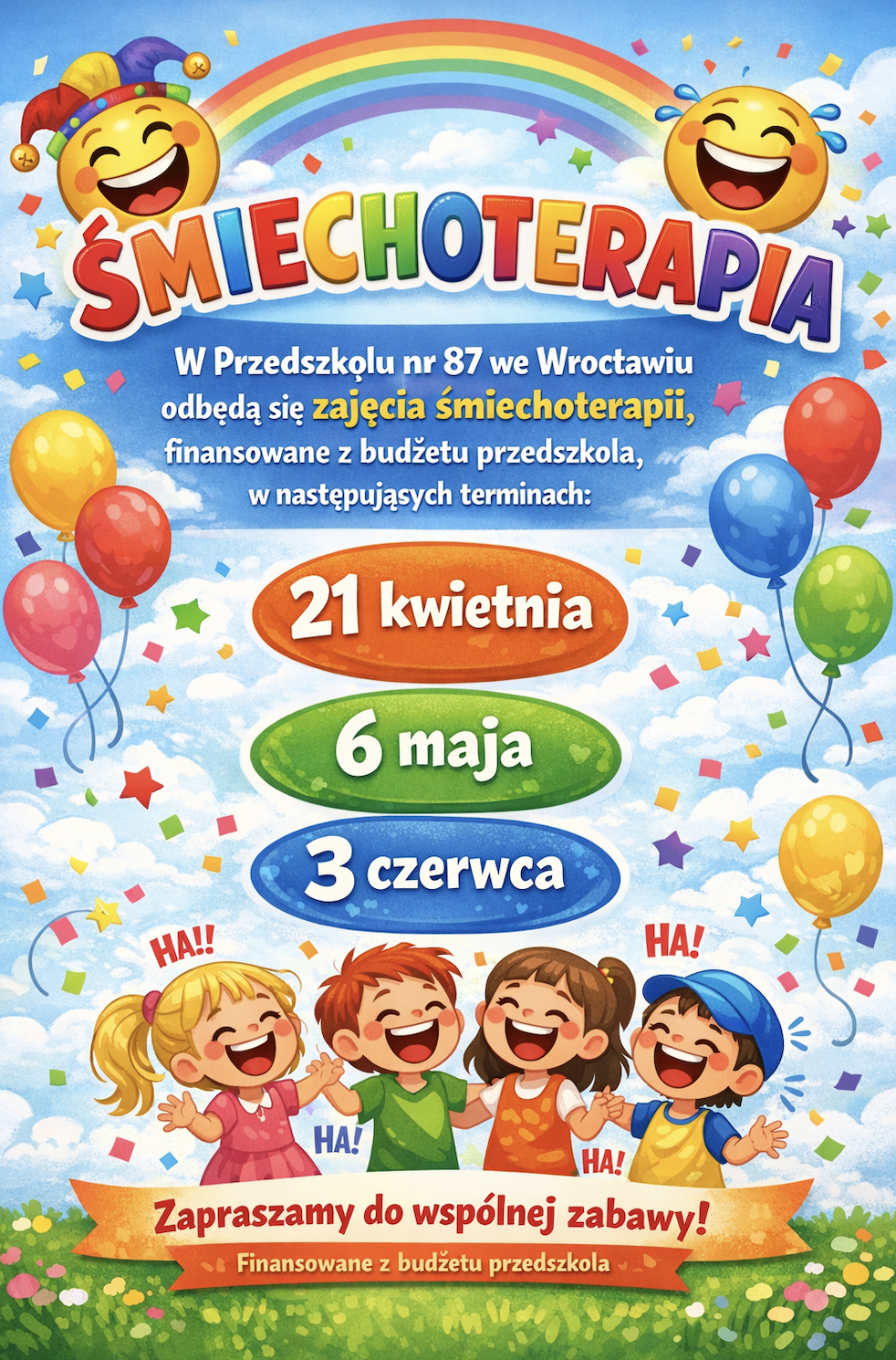 informuje, ze w naszym przedszkolu odbędą się zajęcia ze ŚMIECHOTERAPII, finansowane ze środków budżetu przedszkola